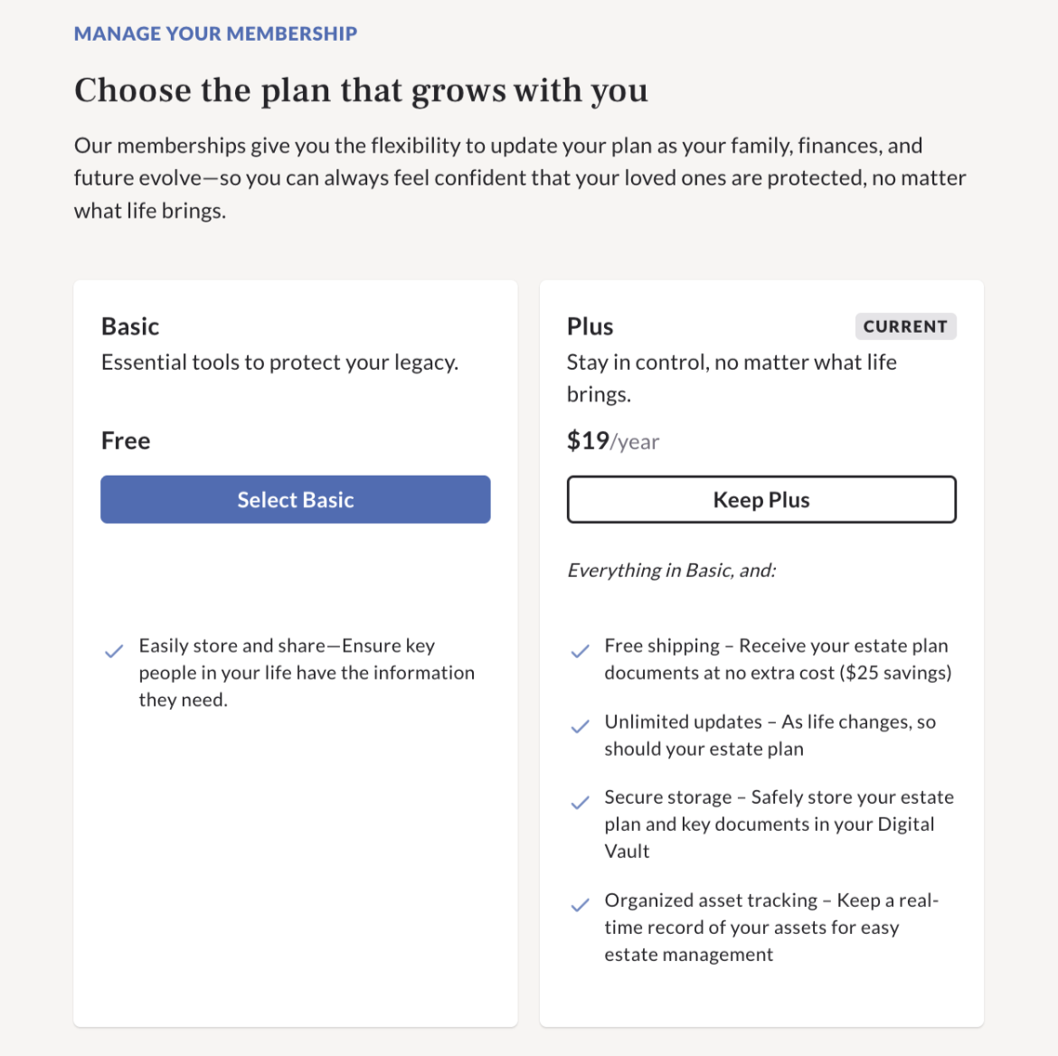 - You'll see the option to switch to the Basic membership (free) or keep your current Plus membership for the yearly renewal fee.