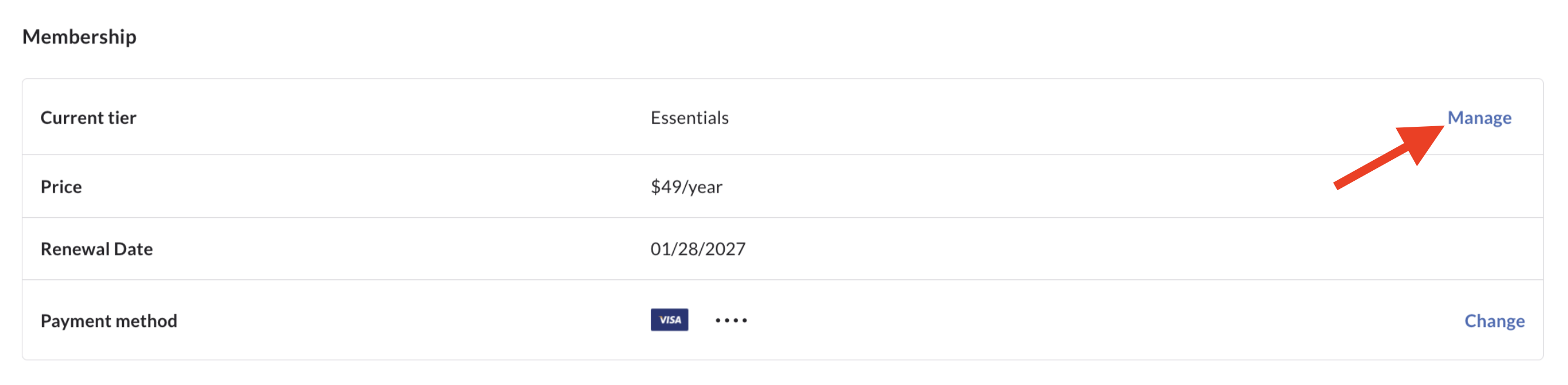 - You'll see the option to upgrade to the Pro membership, keep your current Essentials membership for the yearly renewal fee, or cancel your membership.